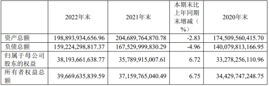 截至2022年末,中泰证券资产总额为1988.94亿元,同比减少2.83%;负债总额为1592.24亿元,同比减少4.96%。