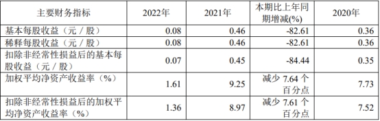 2022年,中泰证券基本每股收益为0.08元/股,同比下降82.61%;加权平均净资产收益率为1.61%,比上年同期减少7.64个百分点;扣除非经常性损益后的加权平均净资产收益率为1.36%,比上年同期减少7.61个百分点。