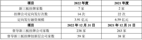 2022年,中泰证券推荐新三板挂牌企业7家;承销挂牌公司定向发行股票14次,融资规模3.91亿元;截至报告期末,持续督导新三板挂牌公司238家,其中,创新层公司59家。