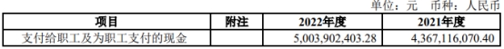 2022年,中泰证券支付给职工及为职工支付的现金为50.04亿元,上年同期为43.67亿元。