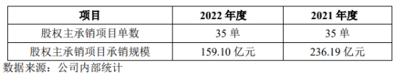 2022年,中泰证券共完成35单股权主承销项目发行,合计承销规模159.10亿元,其中,IPO项目8单、配股项目1单、非公开发行项目25单、可转债项目1单。