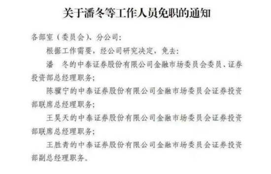 网传的任免通知显示,中泰证券近期免去金融市场委员会委员、证券投资部总经理潘冬,金融市场委员会证券投资部联席总经理陈骥宁,金融市场委员会证券投资部联席总经理王昊天以及金融市场委员会证券投资部副总经理王胜青共4位负责人职务。