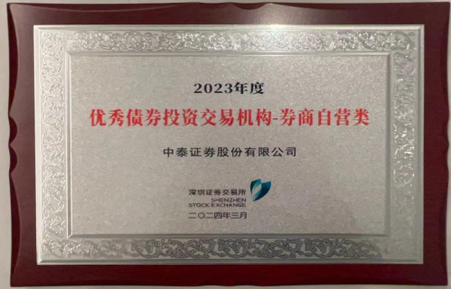 3月11日,深圳证券交易所举行2023年度深交所债券监管发展业务座谈会,回顾总结2023年深交所债券市场建设工作,研究部署推进2024年重点任务。会上表彰了2023年度深交所债券优秀参与机构及个人,中泰证券继2022年度荣获“优秀债券投资交易机构-券商自营类”之后,2023年度再次获得该项荣誉。