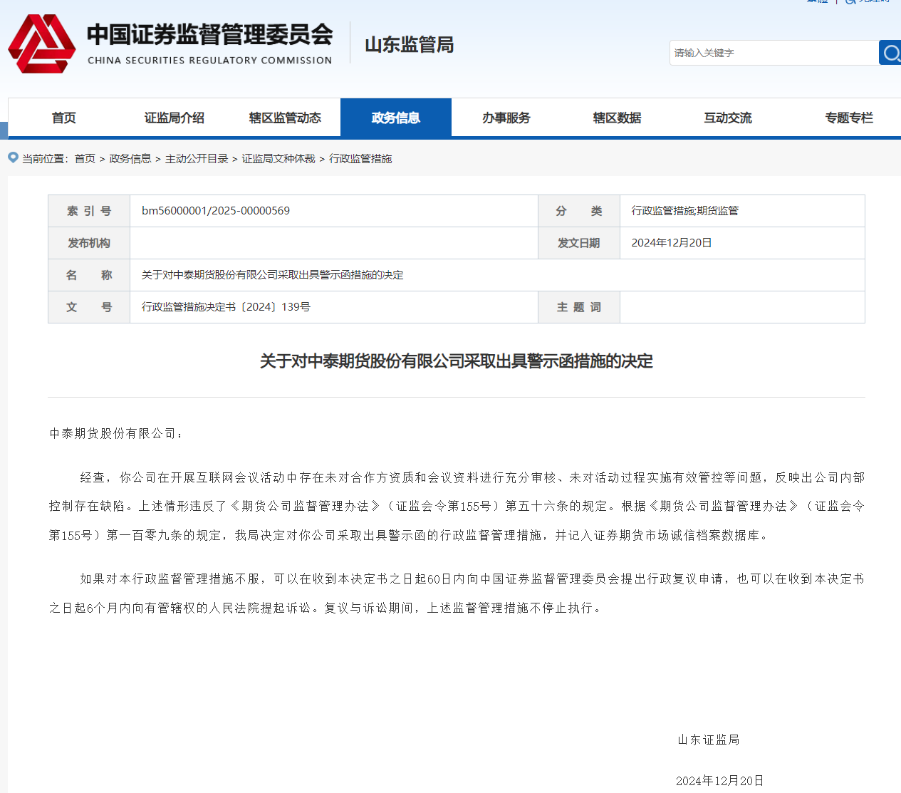 经查,中泰期货在开展互联网会议活动中存在未对合作方资质和会议资料进行充分审核、未对活动过程实施有效管控等问题,反映出公司内部控制存在缺陷。上述情形违反了《期货公司监督管理办法》(证监会令第155号)第五十六条的规定。根据《期货公司监督管理办法》(证监会令第155号)第一百零九条的规定,山东证监局决定对中泰期货采取出具警示函的行政监督管理措施,并记入证券期货市场诚信档案数据库。