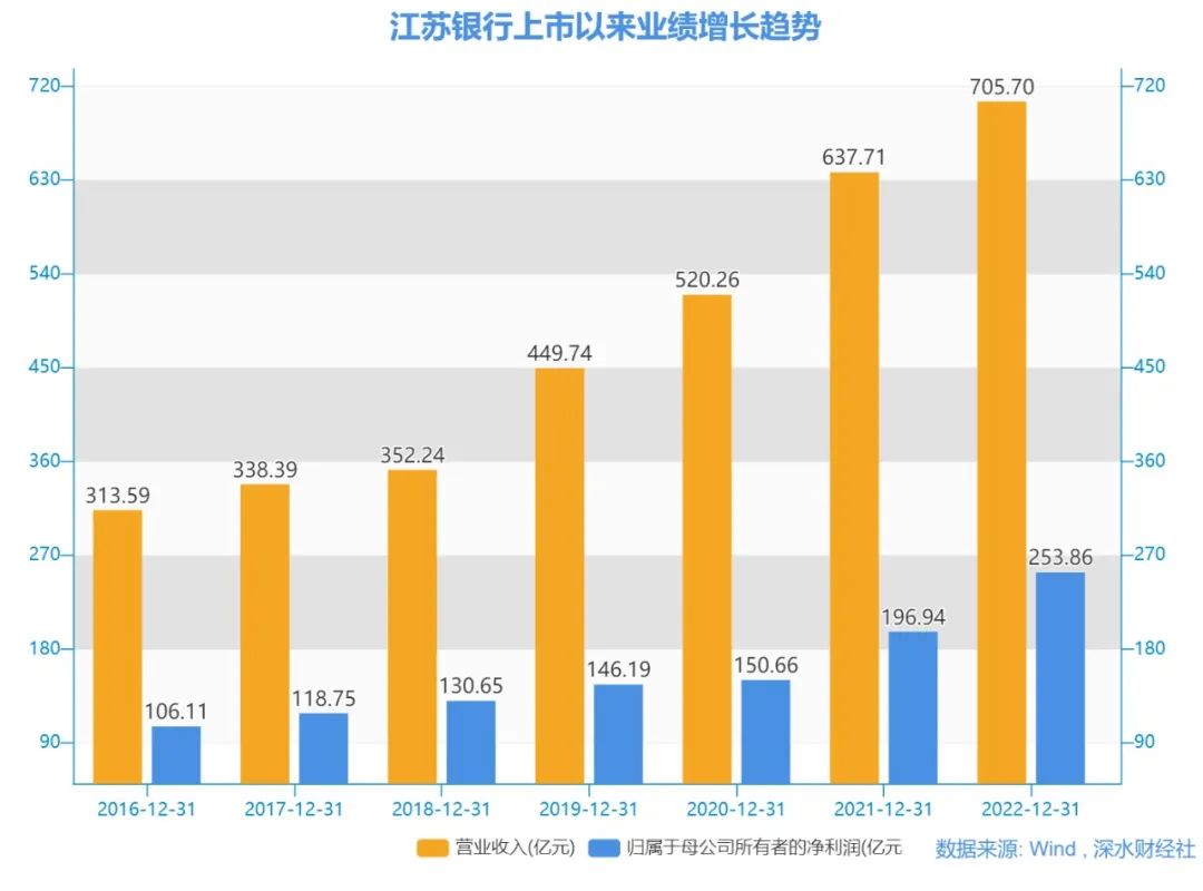 在业绩方面,江苏银行2022年依然保持稳健增长,全年实现营业收入705.70亿元,同比增长10.66%;归属于上市公司股东的净利润253.86亿元,同比增长28.90%。