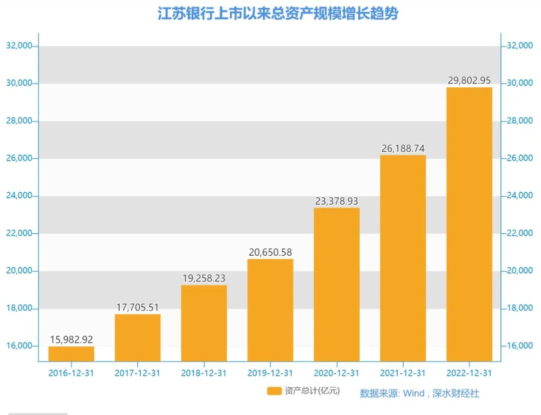 江苏银行年报显示,截至2022年末,该行资产总额2.98万亿元,较上年末增长13.80%,距离突破3万亿大关仅一步之遥,也是2016年上市当年末的1.86倍,接近翻了一番。总规模位居上市银行第16位,在国内城商行中仅次于北京银行位居第二位。