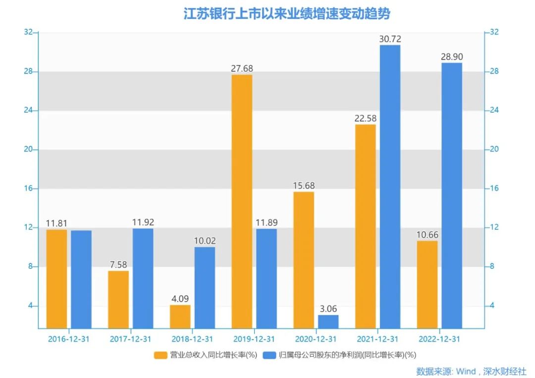 第一个阶段是刚上市的2016年到2018年,这几年江苏银行的业绩不温不火。