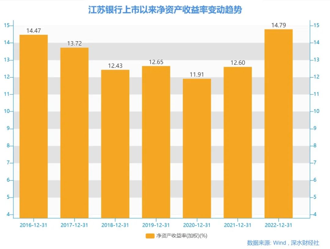 数据显示,江苏银行自2016年上市七年以来,其净资产收益率(加权)有六年都在12%以上,到2022年更是高达14.79%,在42家上市银行中位居第二位。