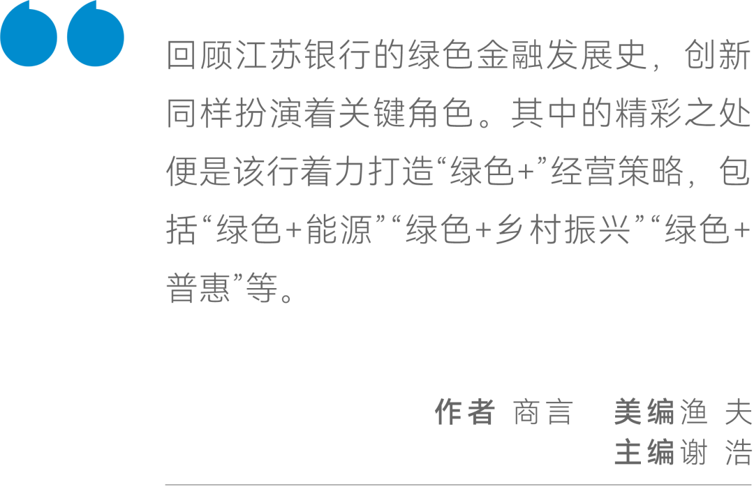 回顾江苏银行的绿色金融发展史,创新同样扮演着关键角色。其中的精彩之处便是该行着力打造“绿色+”经营策略,包括“绿色+能源”“绿色+乡村振兴”“绿色+普惠”等。