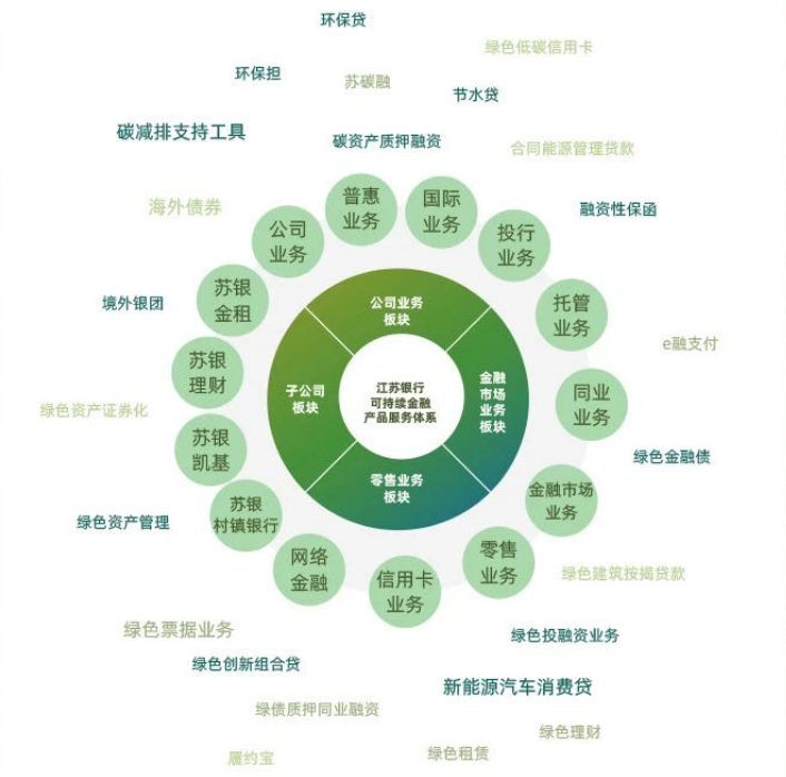 江苏银行已建立涵盖公司信贷、投行、普惠、网金、跨境、零售、同业、理财、租赁等九大业务板块的绿色金融集团化产品体系。