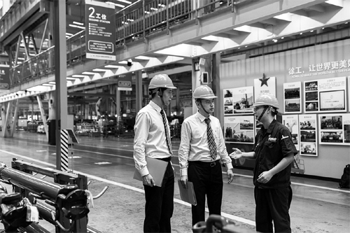 江苏银行工作人员走访制造业企业生产车间,了解企业金融服务需求。
