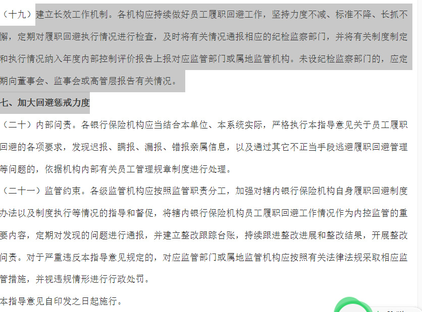 要求“各机构应持续做好员工履职回避工作,坚持力度不减、标准不降、长抓不懈,定期对履职回避执行情况进行检查,及时将有关情况通报相应的纪检监察部门,并将有关制度制定和执行情况纳入年度内部控制评价报告上报对应监管部门或属地监管机构。”