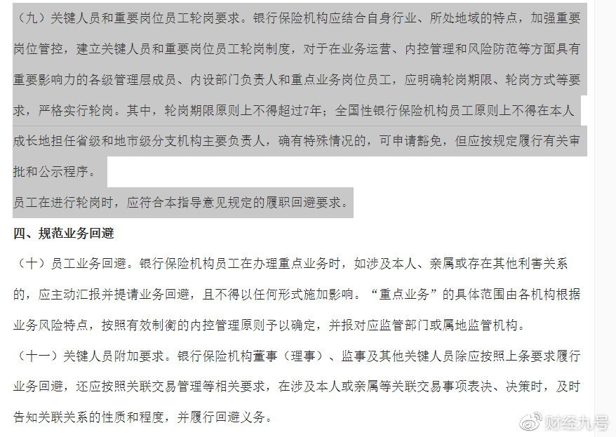 该指导意见明确指出,要对关键人员和重要岗位员工严格实行轮岗要求,其中轮岗期限原则上不得超过7年。