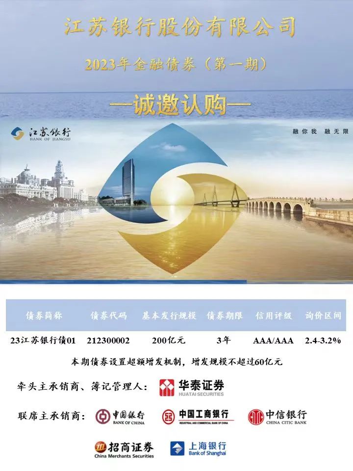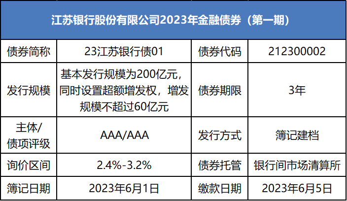 2023年6月1日,江苏银行股份有限公司将在全国银行间债券市场发行2023年金融债券(第一期)。本期债券主体与债项评级均为AAA,发行规模为人民币260亿元,其中基本发行规模200亿,增发规模不超过60亿元,债券期限为3年。本期债券发行的募集资金将依据适用法律和主管部门的批准,用于满足资产负债配置需要,充实资金来源,优化负债期限结构,促进业务的稳健发展。