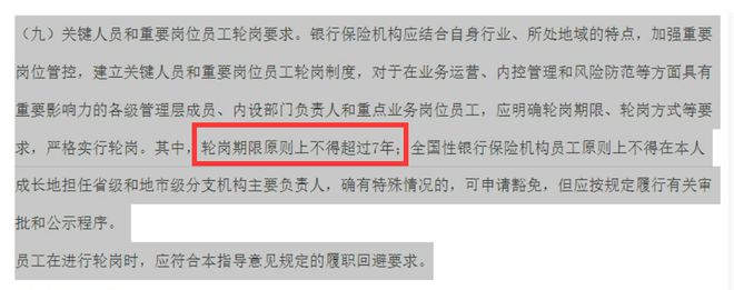 2019年12月,原中国银保监会印发了《关于银行保险机构员工履职回避工作的指导意见》(以下称指导意见),该指导意见明确指出,要对关键人员和重要岗位员工严格实行轮岗要求,其中轮岗期限原则上不得超过7年。(图源:财经九号)