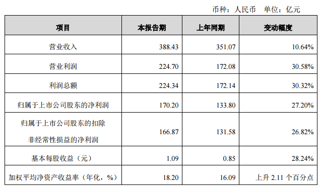 在业绩方面,在整个银行业资产端增长乏力的背景下,江苏银行上半年营收同比增速仍然达到两位数增长,当期实现营收388.43亿元,同比上涨10.64%;归母净利润170.2亿元,同比上涨27.2%。