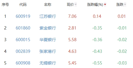 其中,江苏银行、紫金银行、华夏银行、张家港行、无锡银行位列板块涨幅前五位,涨幅分别为0.14%、-0.35%、-0.36%、-0.43%、-0.55%。