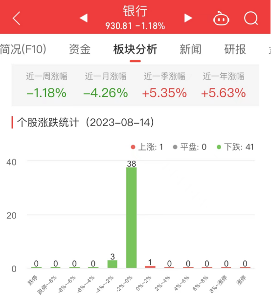 中国经济网北京8月14日讯今日,银行板块整体跌幅1.18%,其中1只股票上涨,0只股票平盘,41只股票下跌。