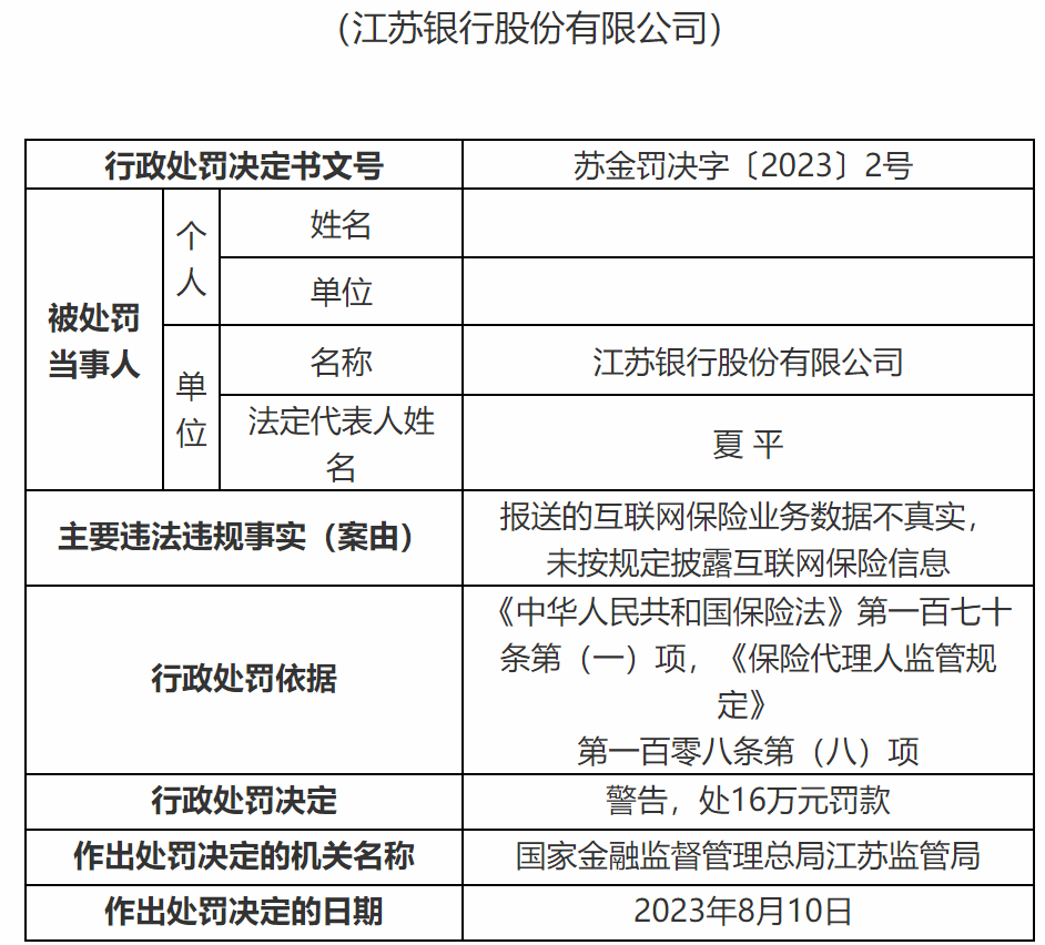 据8月18日国家金融监督管理总局江苏监管局公布的行政处罚信息公开表,江苏银行股份有限公司因报送的互联网保险业务数据不真实、未按规定披露互联网保险信息,被江苏监管局警告并处16万元罚款。