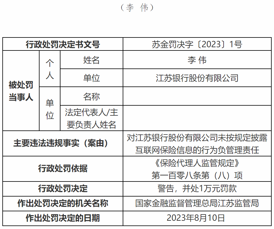 另外,李伟对江苏银行股份有限公司未按规定披露互联网保险信息的行为负管理责任,被江苏监管局警告并处1万元罚款。