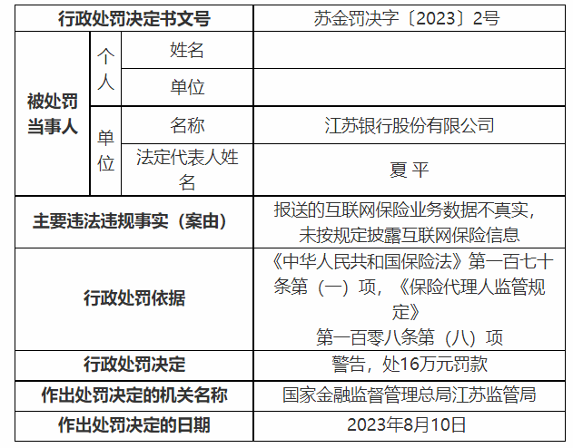 8月18日,国家金融监督管理总局江苏监管局发布的一则行政处罚信息公开表苏金罚决字〔2023〕2号显示,江苏银行(600919.SH)存在“报送的互联网保险业务数据不真实,未按规定披露互联网保险信息”的违法违规事实,国家金融监督管理总局江苏监管局依据《中华人民共和国保险法》第一百七十条第(一)项,《保险代理人监管》第一百零八条第(八)项规定,决定对江苏银行股份有限公司警告,罚款金额16万元。
