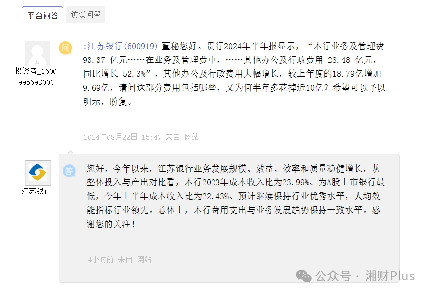 湘财Plus以普通投资者的身份向江苏银行咨询该行其他办公及行政费用为何较上年同期增加近10亿元的问题,该行于8月26日进行了回复。不过,该回复与此前业绩说明会的回复完全一样,并未给予正面回应,且未解释该费用的构成及同比大幅增长的原因。