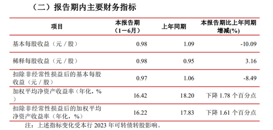 受到2023年可转债转股的影响,上半年,江苏银行基本每股收益为0.98元/股,比上年同期减少10.09%,加权平均净资产收益率为16.46%,同比下降了1.78个百分点。