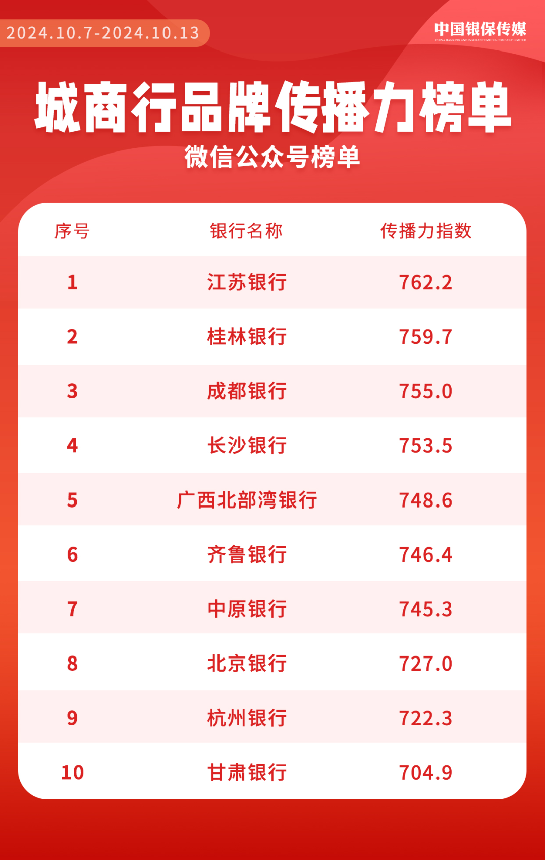 本期微信公众号影响力排行榜中,江苏银行首次登上公众号榜首,以762.2的传播力指数夺得冠军宝座。桂林银行凭借759.7的传播力指数获得第二。成都银行本期成功入榜,以755.0的传播力指数获得第三。这些城商行通过微信公众号平台,有效提升了品牌传播力和市场影响力,同时也展示出金融服务领域的创新和活力。这些成绩对整个行业来说,都具有积极的示范意义。