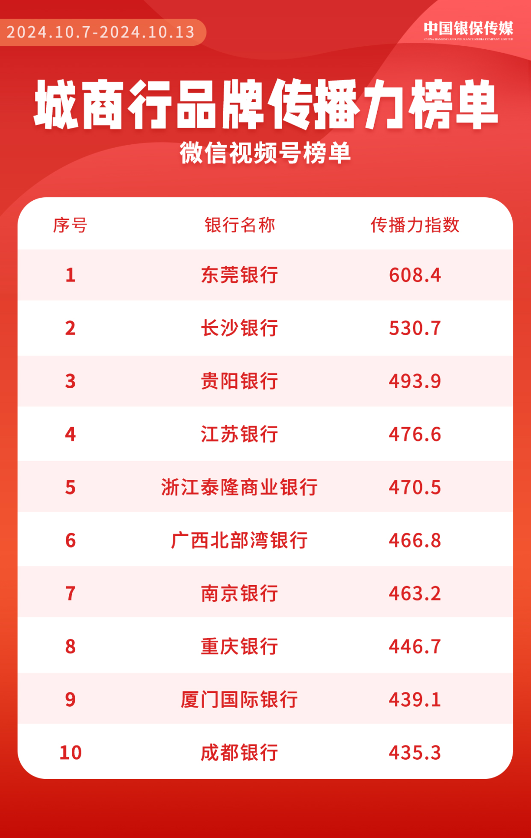 在本期的微信视频号影响力排行榜中,东莞银行表现出色,以608.4的传播力指数荣登榜首。长沙银行以530.7的传播力指数蝉联第二名。贵阳银行以493.9的传播力指数位列第三。这三家银行在视频号平台的卓越表现,不仅为金融行业的社交媒体营销树立了标杆,也为其他品牌在内容创作和增强用户互动方面提供了经验和启示。