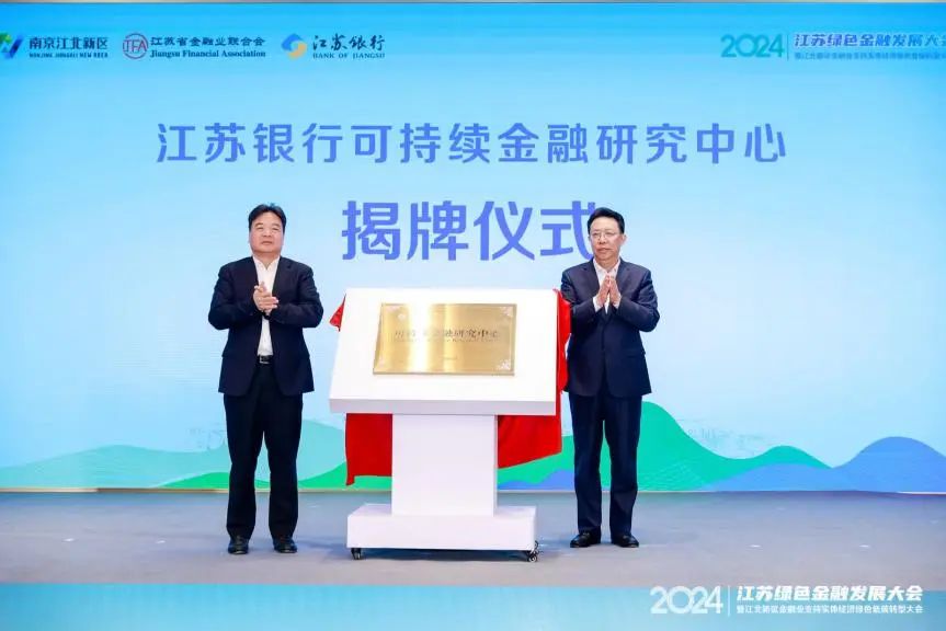 活动现场,江苏银行可持续金融研究中心成功揭牌。这是江苏省首家银行业可持续金融研究中心,由江北新区管委会和江苏银行合作共建。