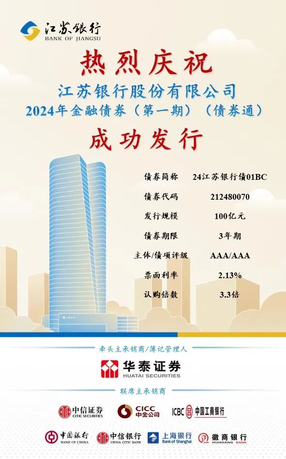 本期债券采用线上簿记建档方式发行,牵头主承销商和簿记管理人为华泰证券。本期债券坚持市场化原则,市场反响热烈,获得投资者的踊跃认购,全场认购倍数3.3倍,投资机构涵盖了商业银行、银行理财子、基金公司、证券公司等多类型投资主体,充分体现了投资者对本期债券投资价值的高度认可。线上簿记发行全流程清晰规范、全程留痕,有效提升了发行效率和透明度。