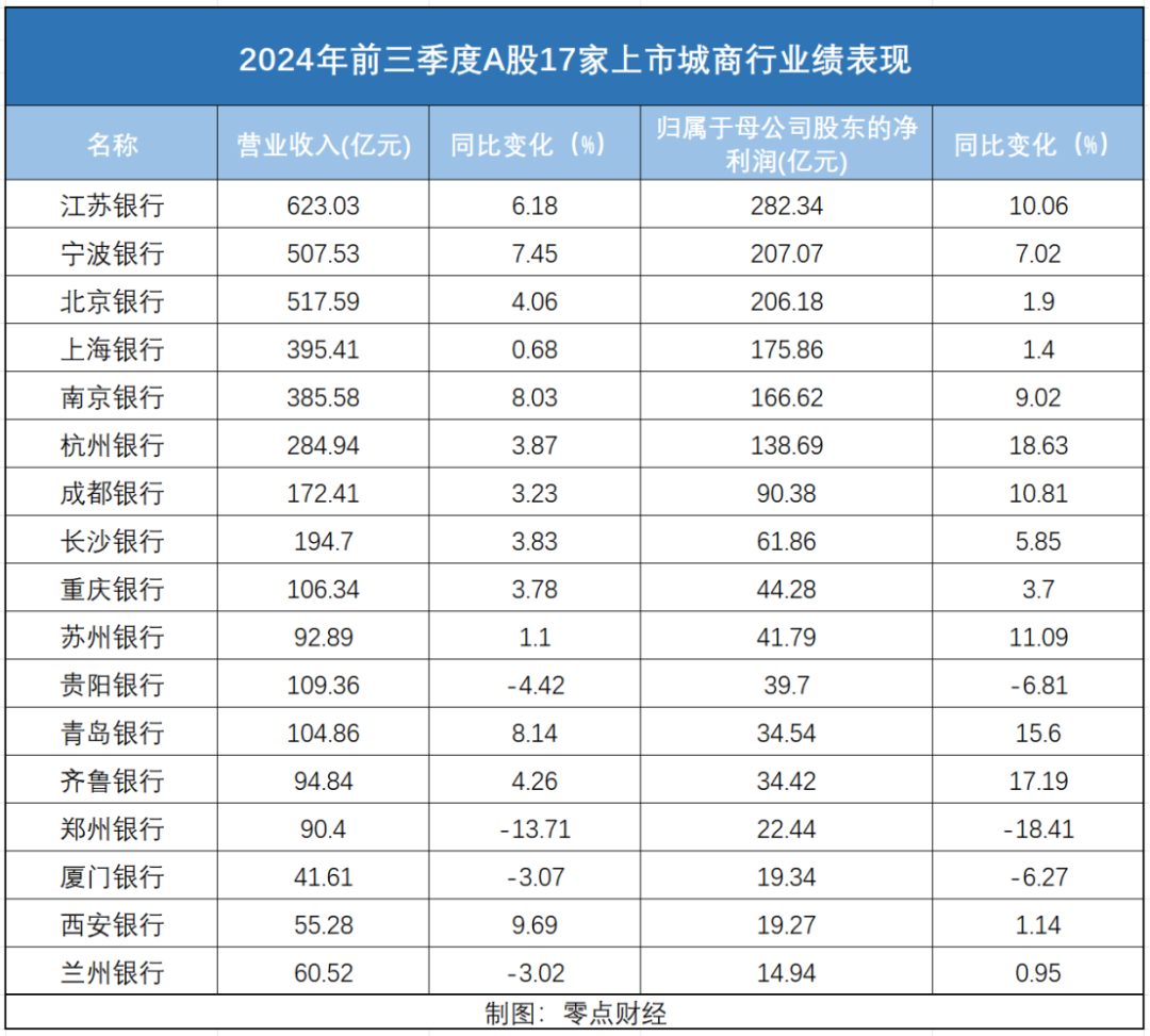 而整个前三季度,该行以营收623.03亿元,同比增长6.18%;归母净利润282.35亿元,同比增长10.06%的业绩在A股17家上市城商行中排名第一。