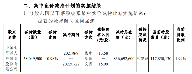 杭州银行公告显示,太平洋人寿减持价格区间为13.58元/股到15.99元/股之间,减持总金额达8.37亿元。