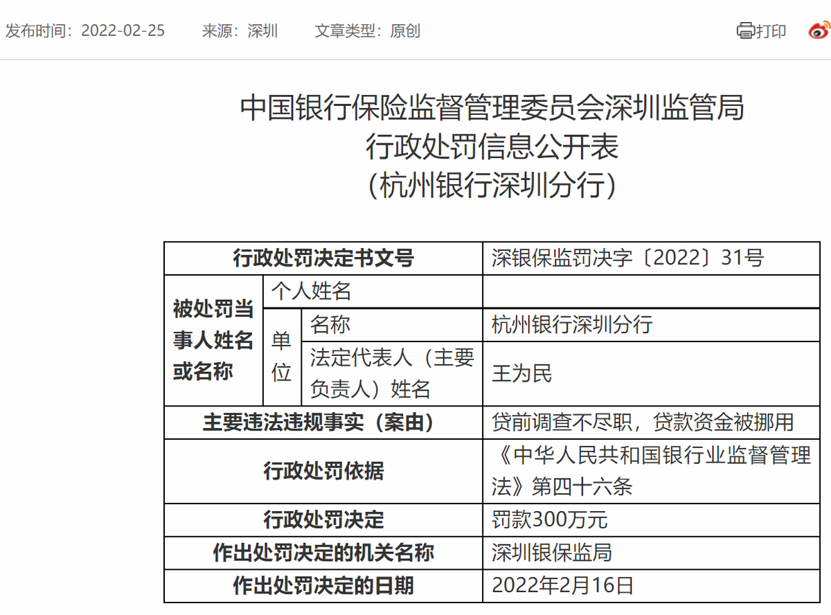 银保监会官网显示,2月25日,杭州银行因“贷前调查不尽职,贷款资金被挪用”被深圳银保监局罚款300万元。记者梳理发现,这是银保监会有史以来对杭州银行开出的最大罚单,不过违规事由却并不鲜见。