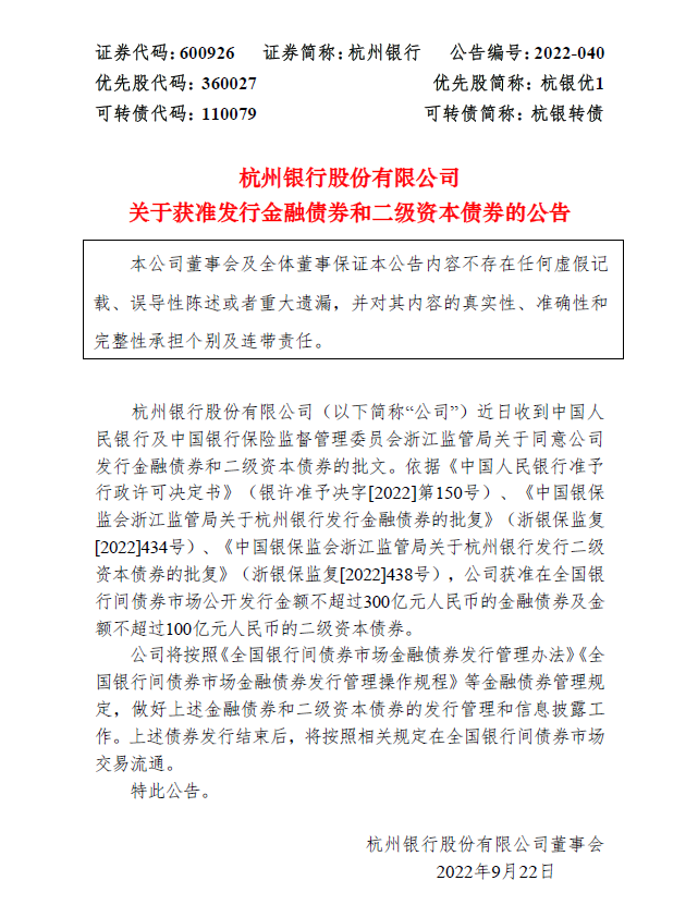 杭州银行关于获准发行金融债券和二级资本债券的公告