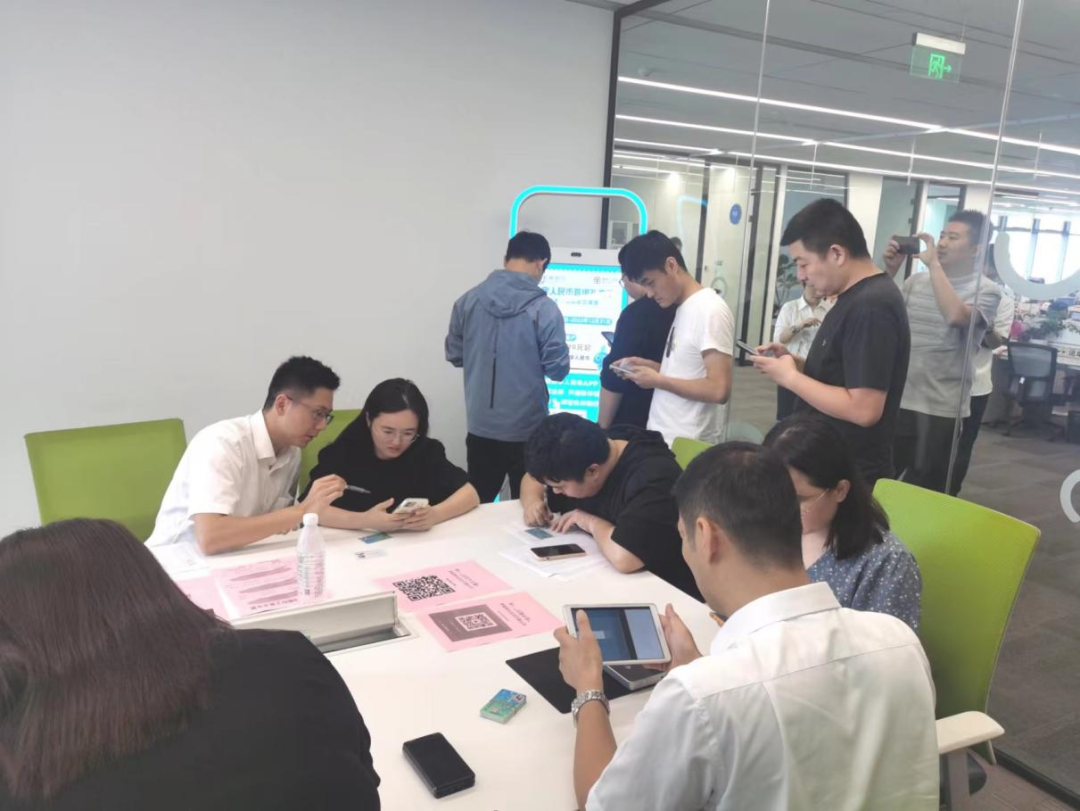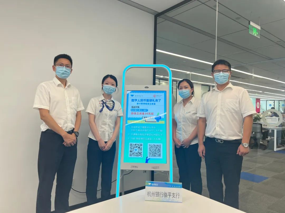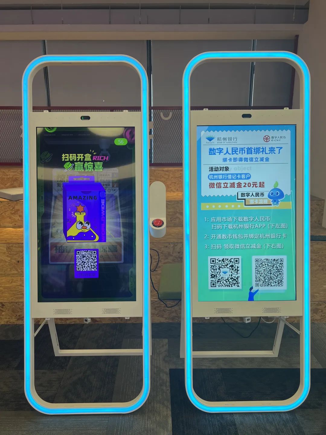 近日,杭州银行首场数字化趣味营销活动在脸脸总部杭州欧美金融城美国中心举行。现场,杭州银行临平支行工作人员以办卡有礼吸引客户,并将目前银行主推的【数字人民币】APP下载流程及福利信息嵌入Hi屏内不断轮播。屏前用户只需用手机扫描Hi屏二维码,便可触发游戏,以娱乐化激活客流,高效带动开卡及APP下载。