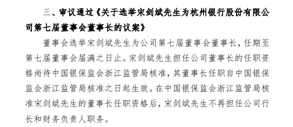 《议案》表示,宋剑斌担任公司董事长的任职资格尚待中国银保监会浙江监管局核准,其董事长任职自中国银保监会浙江监管局核准之日起生效。在银保监会浙江监管局核准宋剑斌的董事长任职资格后,宋剑斌不再担任公司行长和财务负责人职务。