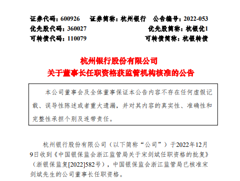 近日,杭州银行发布公告表示,于2022年12月9日收到《中国银保监会浙江监管局关于宋剑斌任职资格的批复》(浙银保监复[2022]582号),银保监会浙江监管局已核准宋剑斌的公司董事长任职资格。