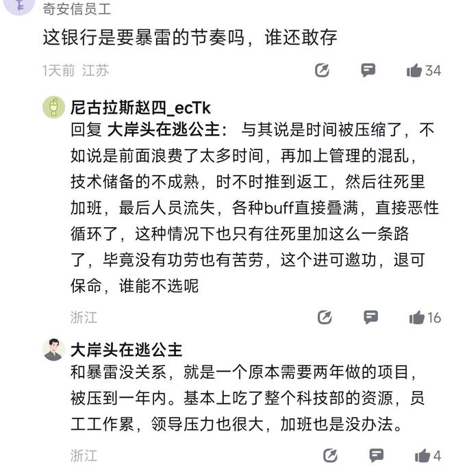 那么,为什么杭州银行会出现这种情况呢?网友分析称,与其说是时间被压缩了,不如说是前面浪费了太多时间,再加上管理的混乱、技术储备的不成熟、时不时推倒返工、然后往死里加班、最后人员流失、直接恶性循环。对于管理者来说,这种情况下也只有往死里压榨员工加班了,毕竟没有功劳也有苦劳,进可邀功,退可保命,谁能不选呢?