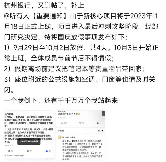 近日有网友爆料,杭州银行以内部项目进入冲刺攻坚阶段为由,今年国庆期间只有9月29日至10月2日放假,共四天,从10月3日开始正常上班,全体成员不得请假。要知道,因为包含了中秋假期,今年国庆足足有八天假。