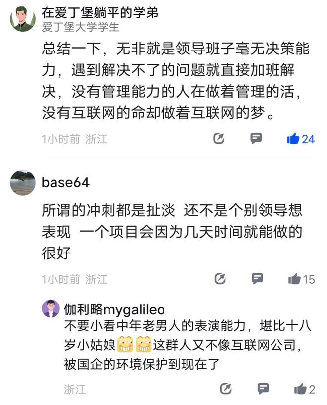 网友对此评论道:领导班子毫无决策能力,遇到解决不了的问题就直接加班解决,没有管理能力的人在做着管理的活,没有互联网的命却做着互联网的梦。