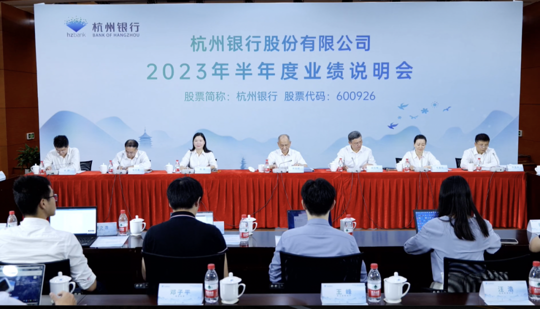 9月20日,杭州银行股份有限公司(下称“我行”,股票代码:600926.SH)通过全网直播的方式召开2023年半年度业绩说明会,党委书记、董事长宋剑斌,党委副书记、行长虞利明,副行长陈岚,副行长潘华富,党委委员、财务总监章建夫以及公司金融部总经理李翔出席了会议。副行长、董事会秘书毛夏红主持本次业绩说明会。