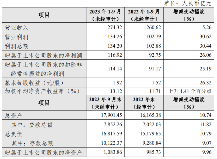 10月19日,杭州银行公告,2023年1-9月,公司实现营业收入274.32亿元,较上年同期增长5.26%;实现归属于上市公司股东的净利润116.92亿元,较上年同期增长26.06%。
