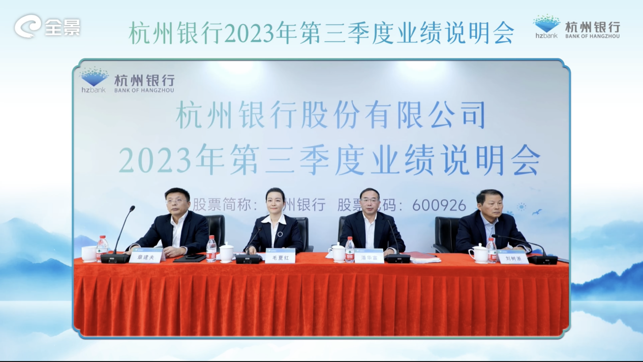 杭州银行2023年第三季度业绩说明会于11月20日15:00-16:00在全景路演举行,杭州银行副行长、董事会秘书毛夏红,杭州银行副行长潘华富,杭州银行财务总监章建夫,杭州银行独立董事刘树浙代表管理层与投资者就公司三季度业绩和近期经营情况进行了交流。