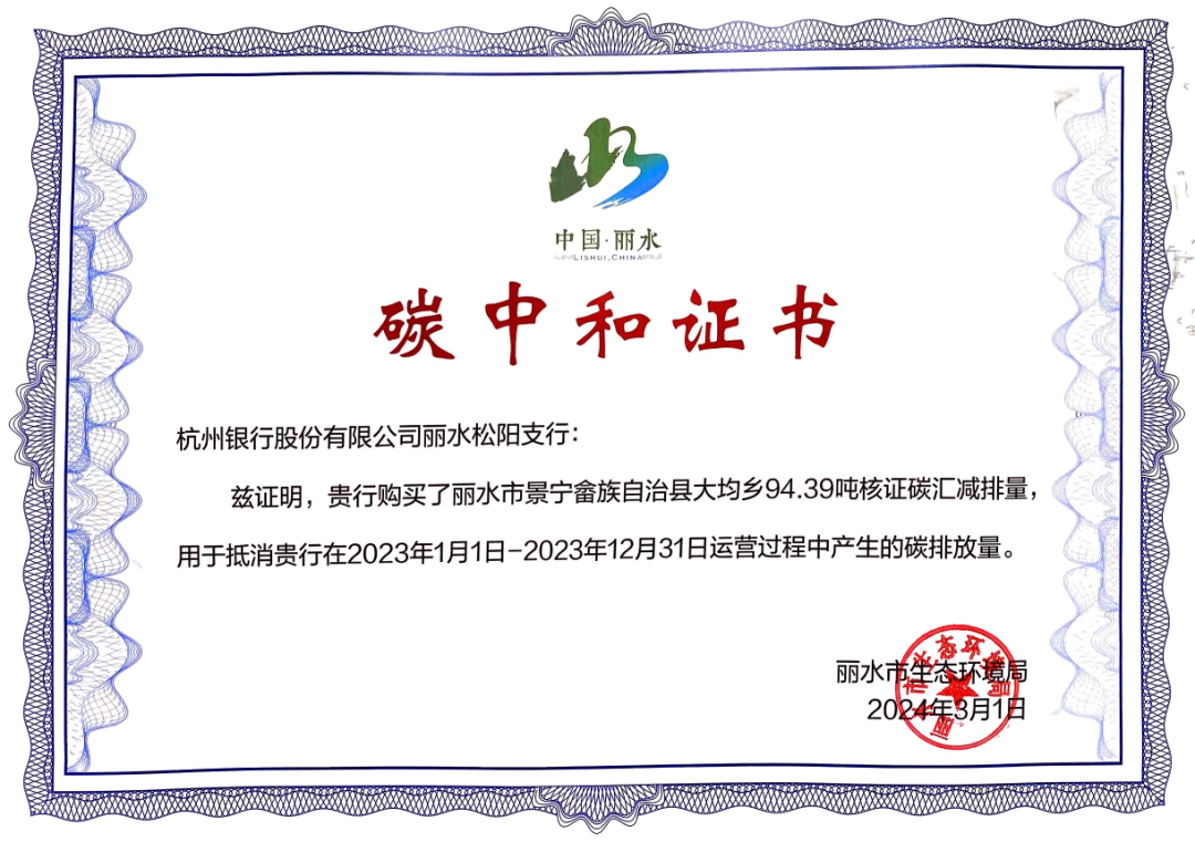 在积极开展绿色金融业务的同时,杭州银行丽水分行以松阳支行为试点积极参与气候友好金融机构创建。参与创建以来,杭州银行丽水松阳支行对照气候友好金融机构指标体系,倡导员工绿色低碳工作生活方式、推进电子化无纸化办公、对网点进行绿色装修、数智化营业布局等方式全方位推进绿色低碳运营,以实际行动引导更广泛的社会力量参与到绿色低碳行动中来,让绿色低碳引领生活新风尚。同时,支行通过开展环保公益活动、绿色金融培训、第三方机构专业碳盘查、购买林业碳汇等措施,实现网点2023年度运营碳中和,并获得丽水市生态环境局颁发的碳中和证书,成功获评2023年度“零碳”金融机构。