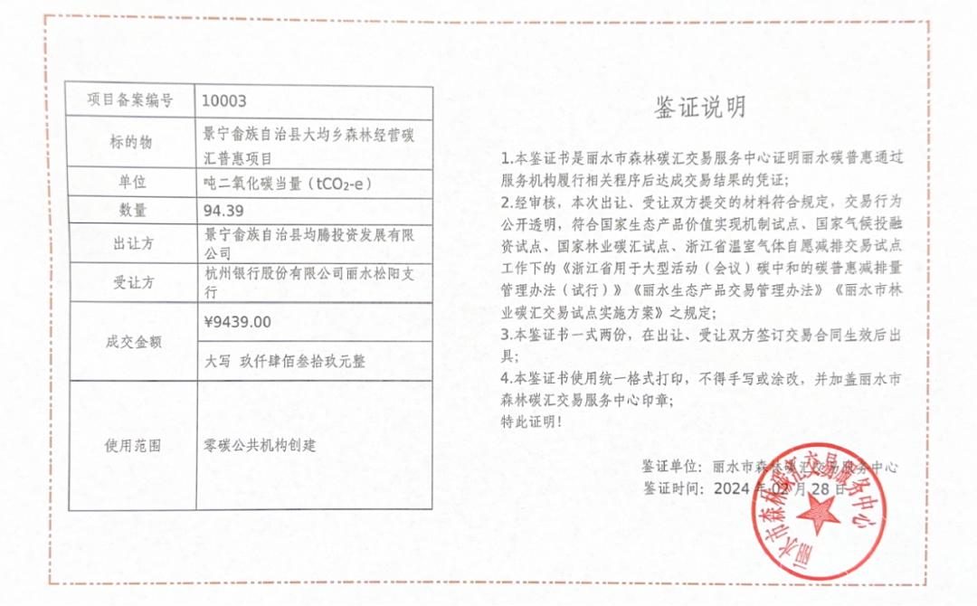 此外,在本次“零碳”网点创建过程中,杭州银行丽水松阳支行通过购买景宁畲族自治县大均乡森林经营碳汇普惠项目实现自身运营碳中和,这也是金融机构积极推动浙江生态产品价值实现机制的一次有益实践,为山区海岛县的共同富裕之路搭建了“绿水青山”向“金山银山”转化的桥梁。