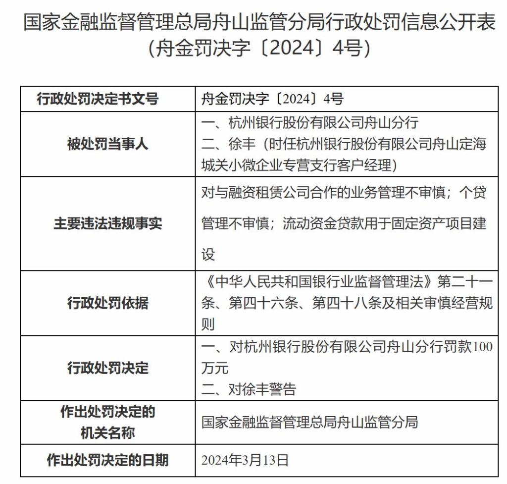 罚单信息显示,因与融资租赁公司合作的业务管理不审慎、个贷管理不审慎、流动资金贷款用于固定资产项目建设三项违法违规事实,杭州银行被罚款100万元。此外,时任杭州银行舟山定海城关小微企业专营支行客户经理徐丰也受到了警告。