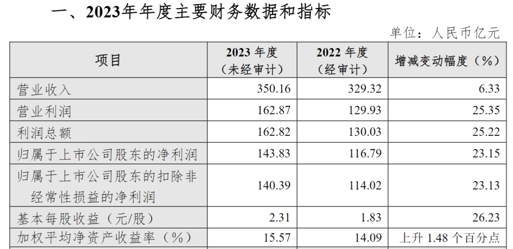 从盈利情况来看,2023年全年,该行实现营业收入350.16亿元,较上年同期增长6.33%;实现归属于上市公司股东的净利润143.83亿元,较上年同期增长23.15%。资产质量方面,截至2023年末,该行不良贷款率0.76%,较2022年末下降0.01个百分点;拨备覆盖率为561.42%。