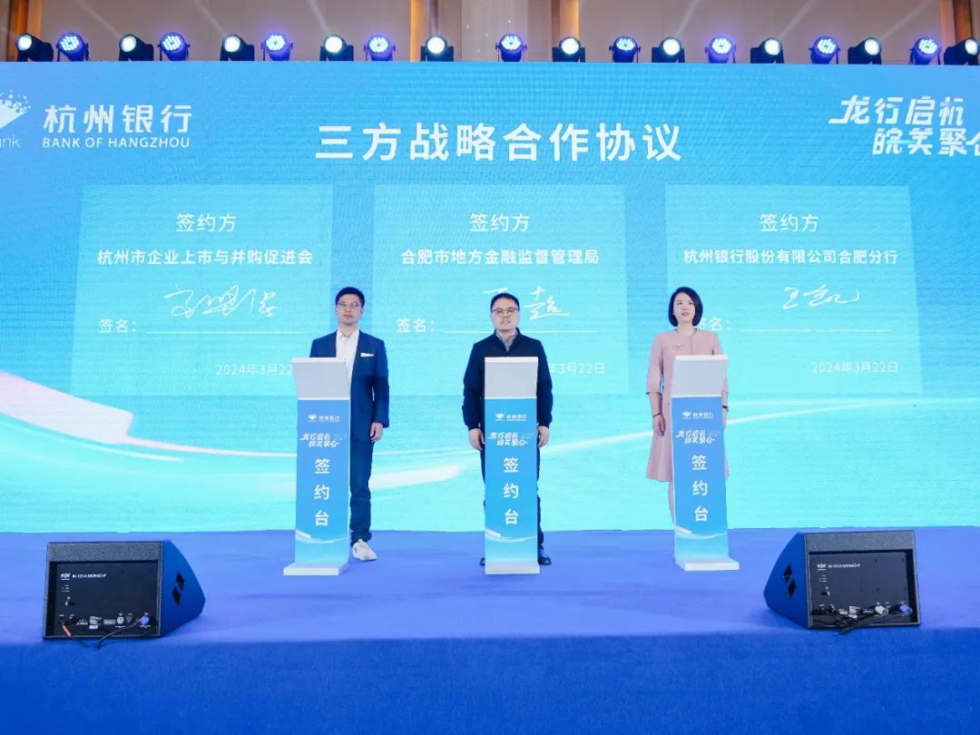 合肥市地方金融监督管理局、杭州市企业上市与并购促进会、杭州银行合肥分行三方签约战略合作协议,共同探索金融服务地方经济发展的新模式、新路径。合肥市投资基金协会、杭州银行合肥分行共同为“基金驿站”揭牌,持续为投资者和优质项目交流合作提供便利,促进地方金融产业发展,加强实体经济服务。