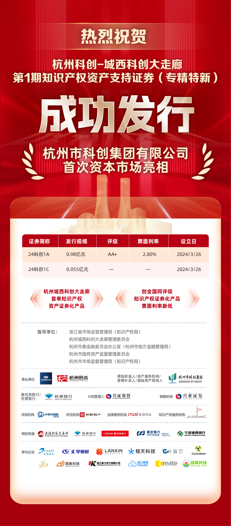 今日,杭州银行参与的“杭州科创-城西科创大走廊第1期知识产权资产支持证券(专精特新)”在上海证券交易所成功发行,发行金额1.035亿元,优先级票面利率2.8%,发行期限1年。该产品为杭州城西科创大走廊首单知识产权资产证券化产品,创全国同评级知识产权证券化产品票面利率新低。